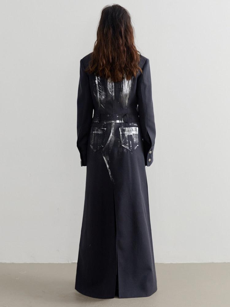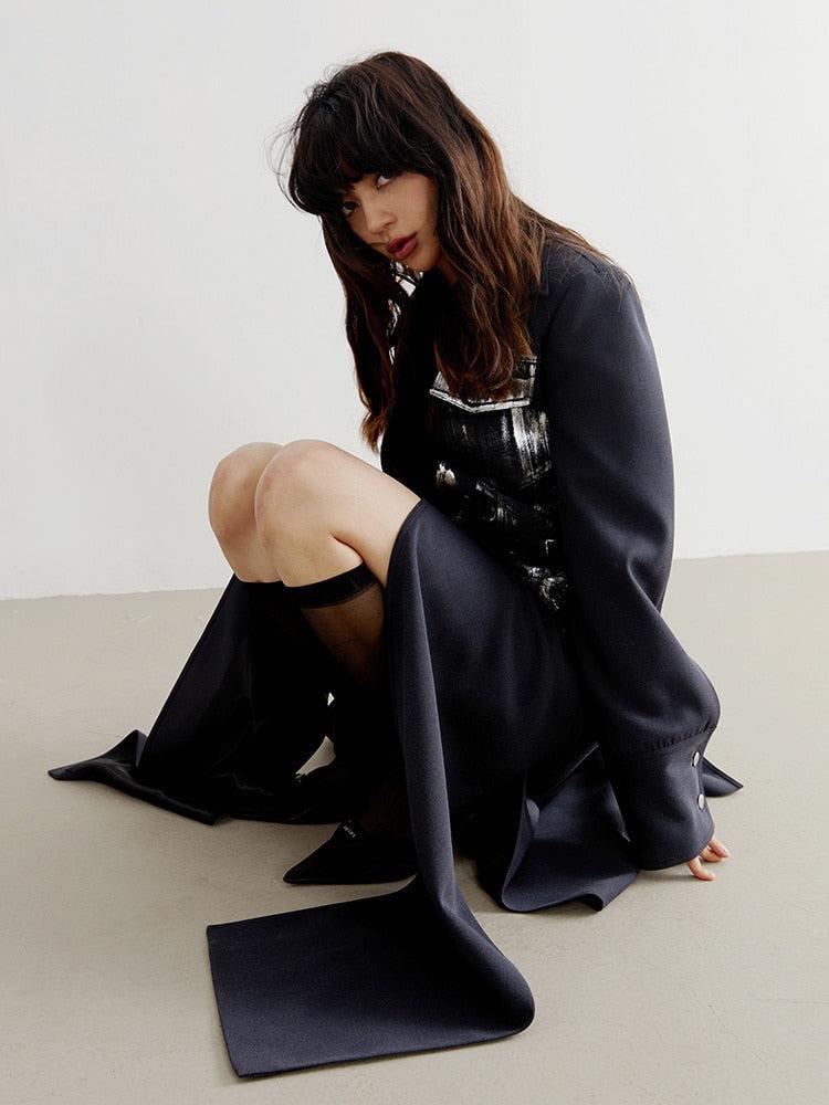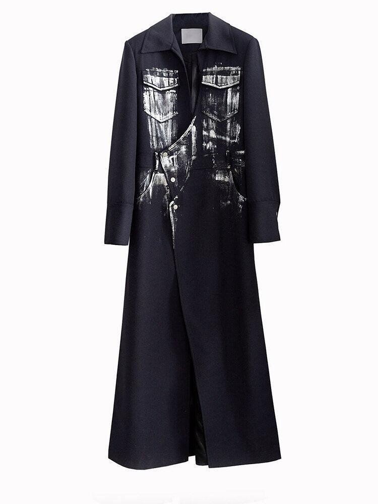 This black, one-piece wonder ingeniously combines a blazer and maxi skirt, presenting a unique take on the distressed aesthetic. With its front button fastening and an array of pockets - two on the hips, two on the chest, and an extra pair at the back, it's not just fashionable but also practical. The invisible split detail adds a surprising twist, while the cotton-polyester blend ensures comfort. Its lapel collar adds a sophisticated touch. For an edgy look, wear it as a dress or pair with bold accessories. Perfect for those who love to experiment with their style.