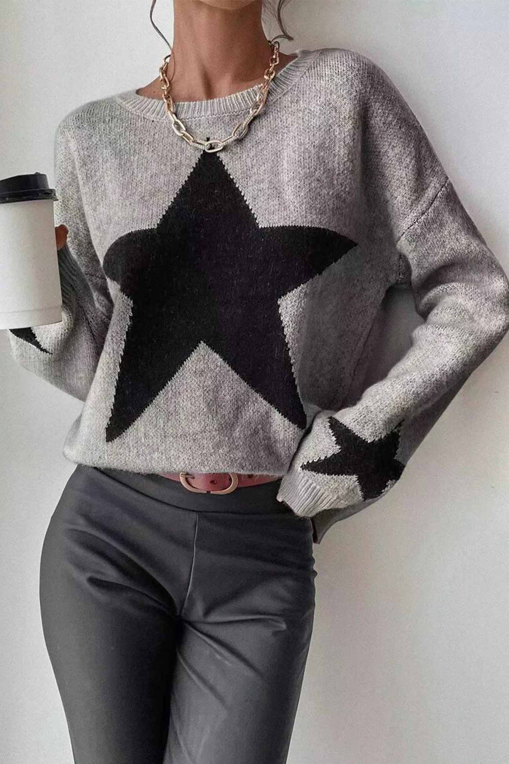Increase quantity for Crew Neck Star Long Sleeve Knitted Sweater
