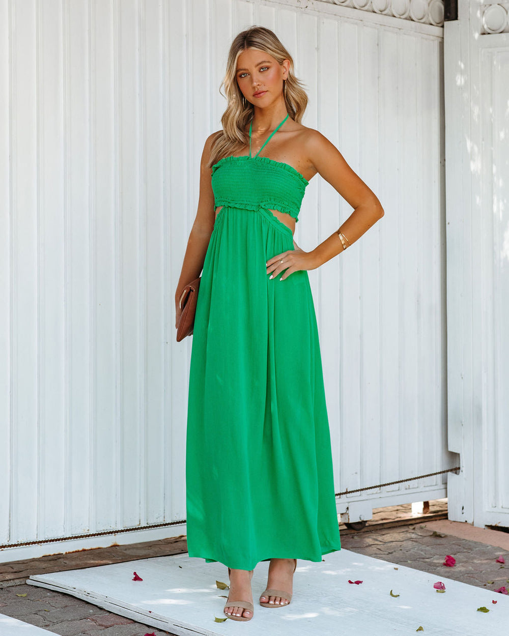 //Best Seller// The Hit The Beach Smocked Halter Maxi Dress in green is the ultimate spring piece that's cut with an open waist and set with a flowy skirt.