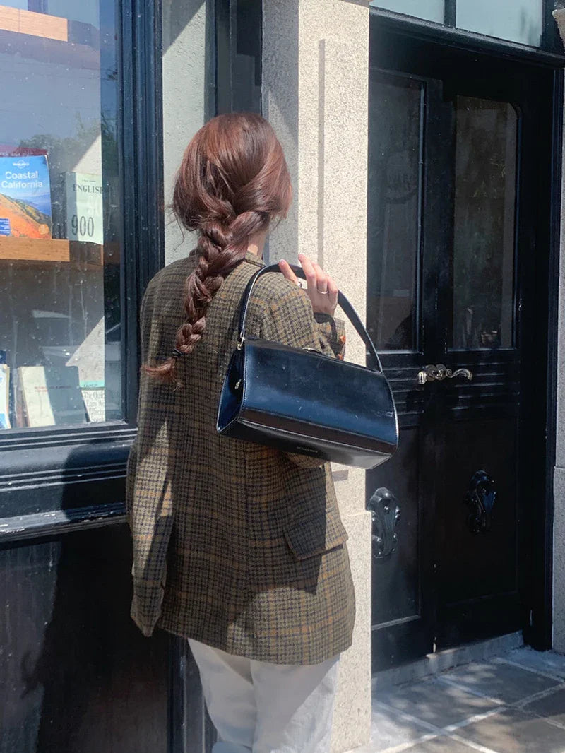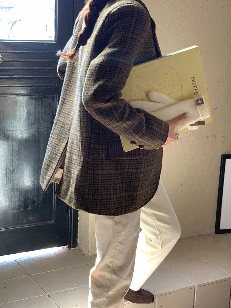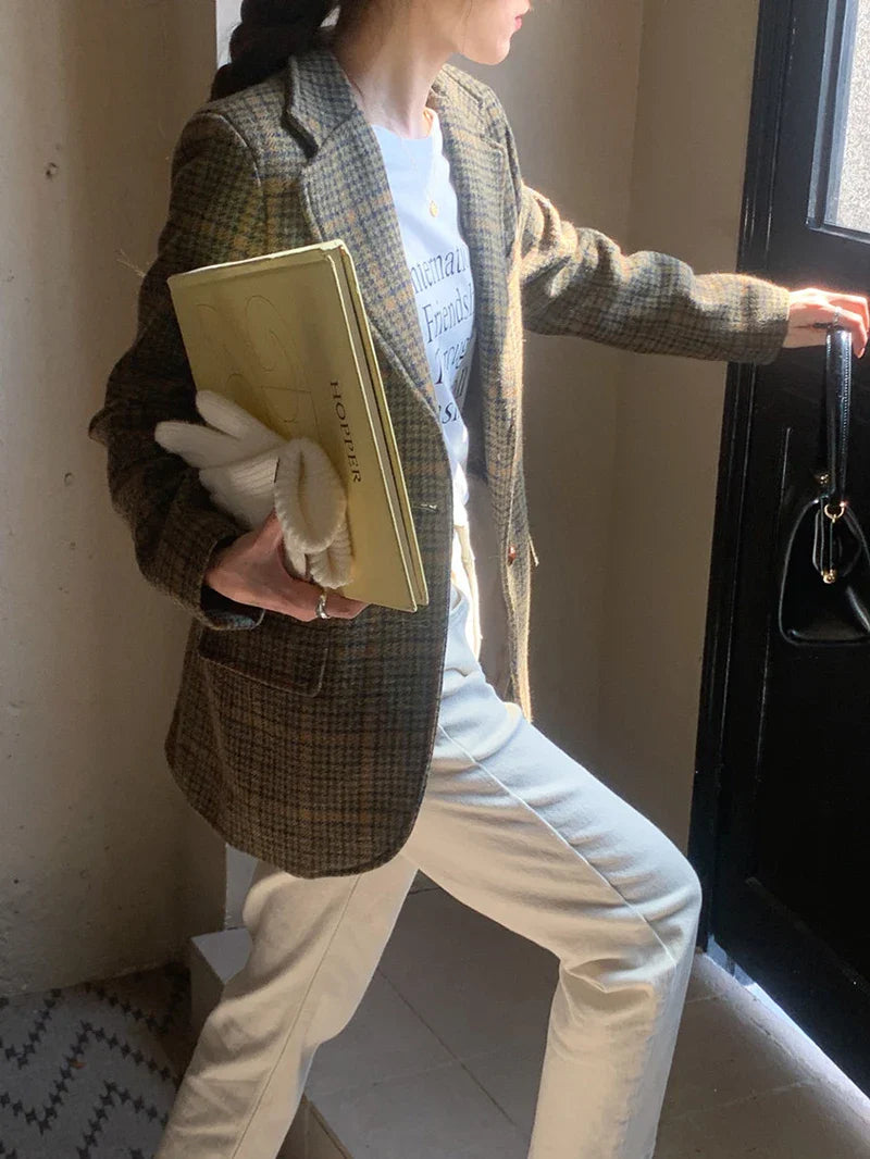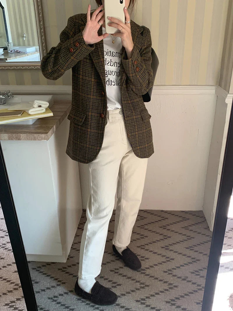 Vintage Wool Blends Coats Women Plaid Woolen Jacket Elegant Commute Blazer Korean Long Sleeve Outerwears Winter Ladies Overcoat