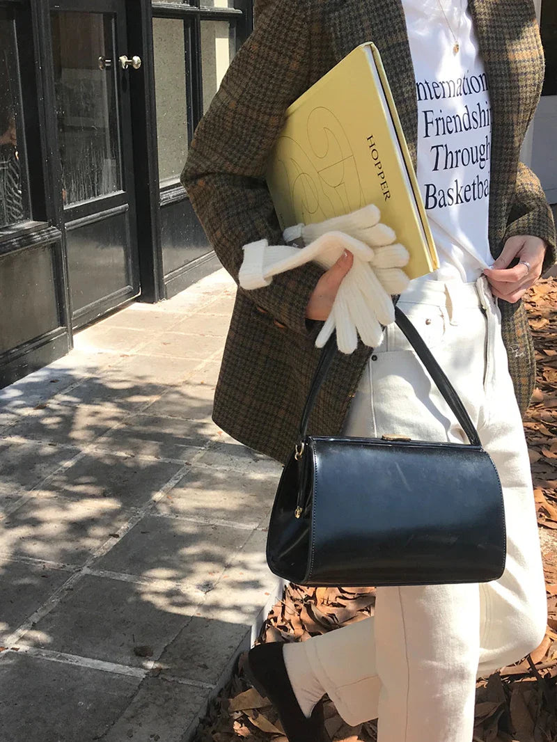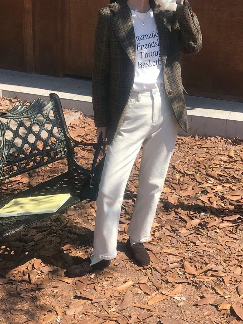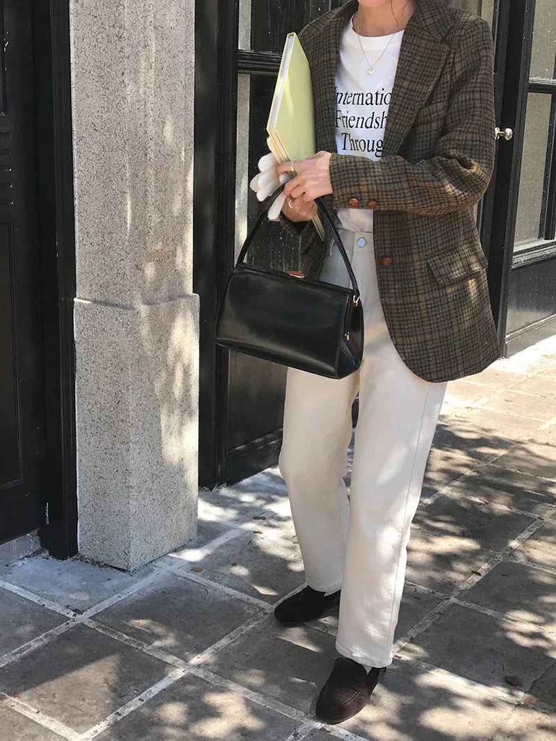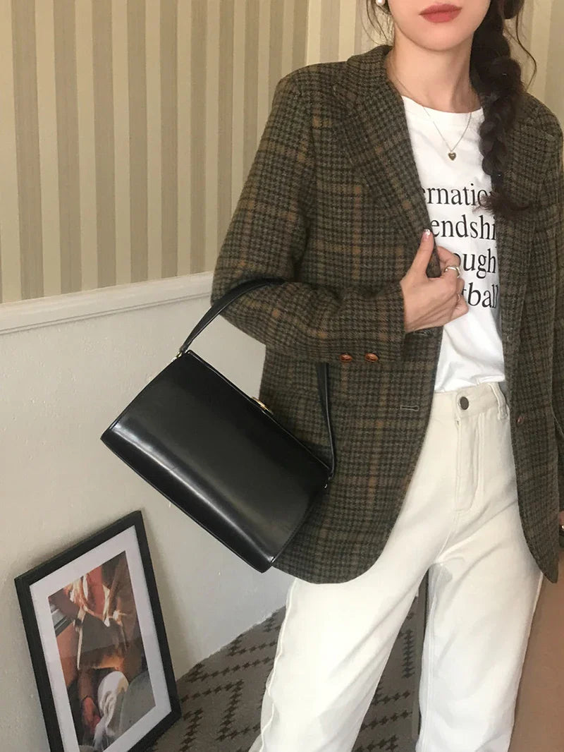 Vintage Wool Blends Coats Women Plaid Woolen Jacket Elegant Commute Blazer Korean Long Sleeve Outerwears Winter Ladies Overcoat