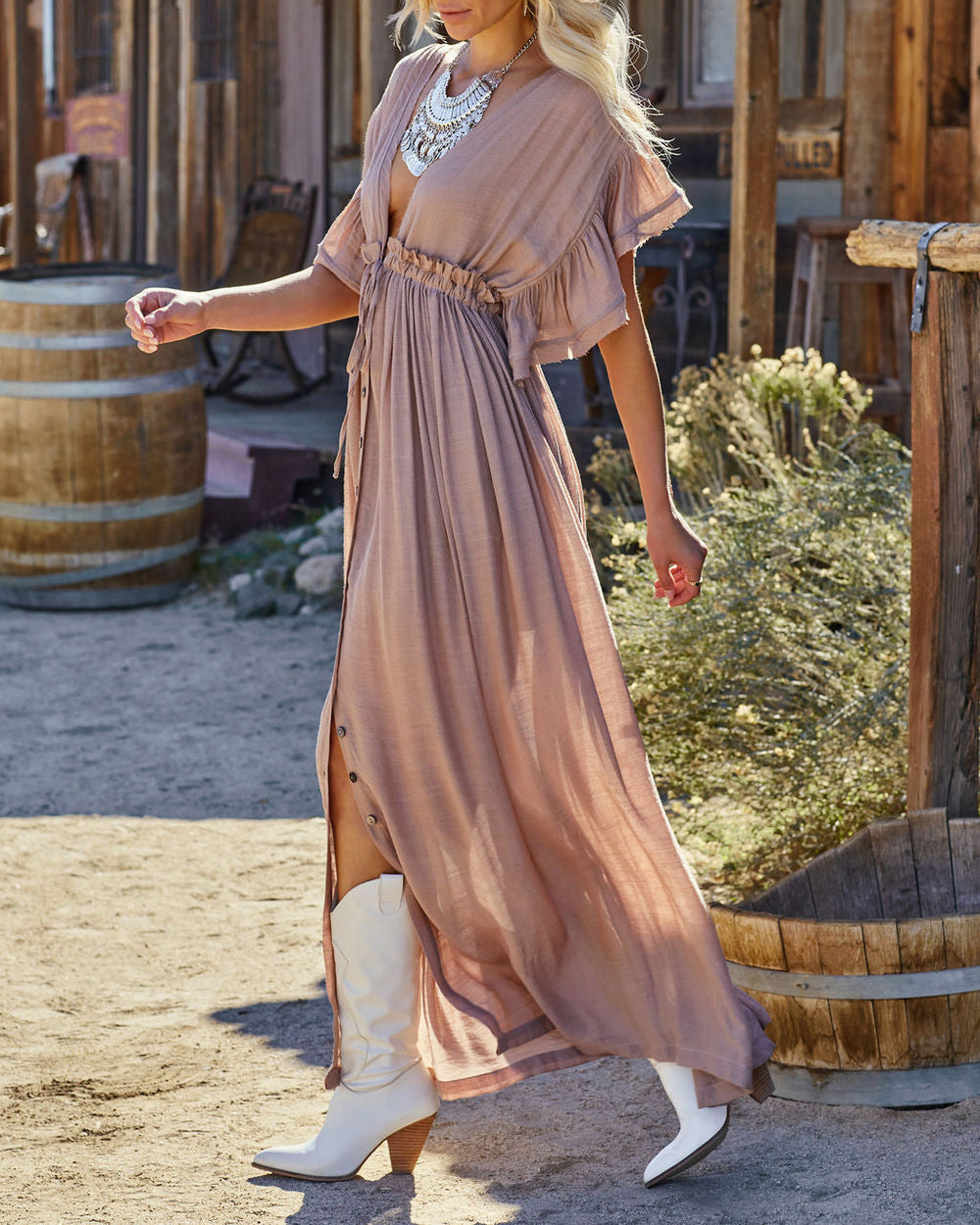 Best Seller The Anika Pocketed Button Down Ruffle Maxi Dress features a lightly textured crepe fabrication in light mocha and fluttery sleeves that meet a plunging v-neckline.