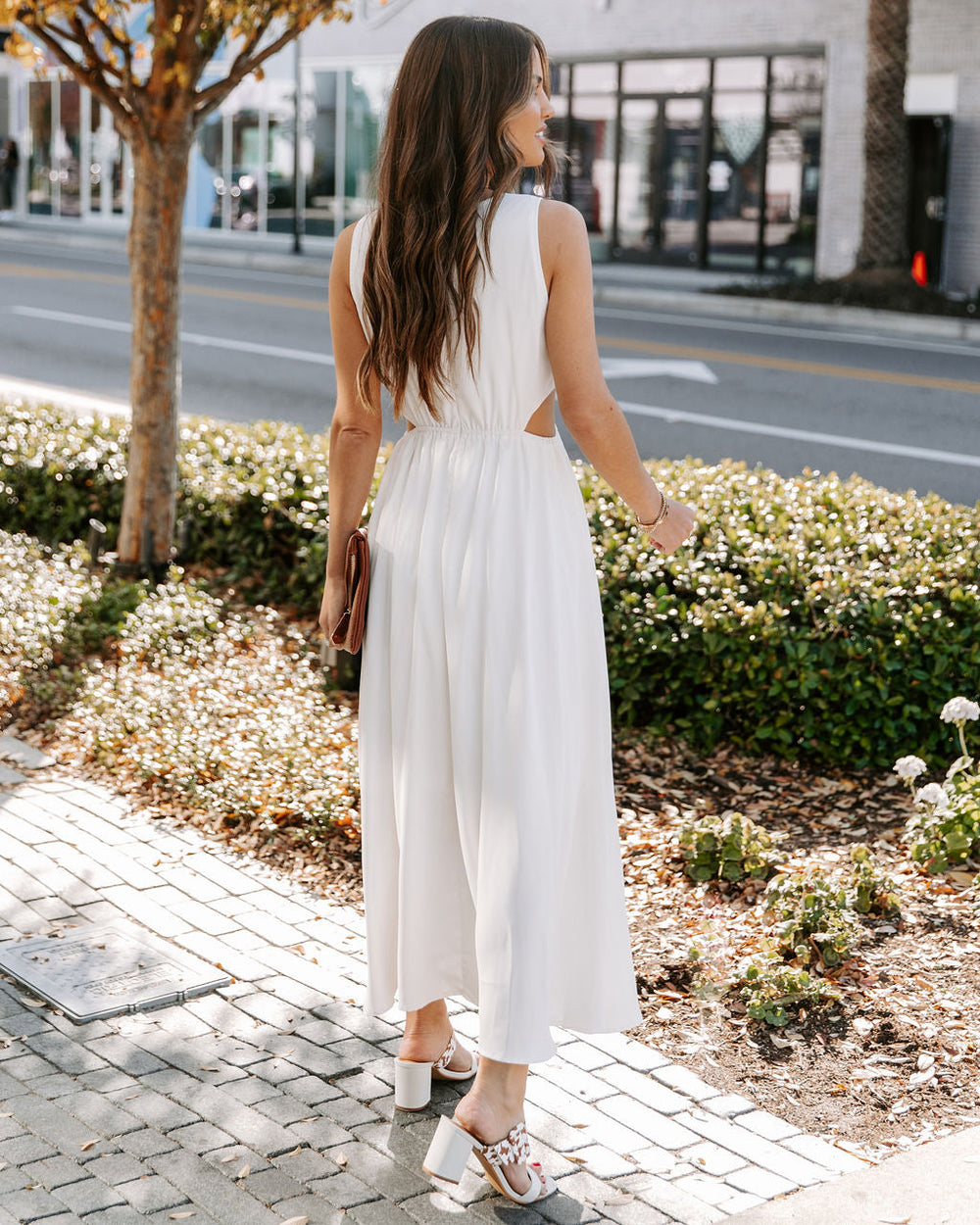 Imaginez-vous flânant dans une ville balnéaire, vêtue de la robe midi Bay Breeze Cutout, couleur blanc cassé, ornée d'un anneau central sur le devant et de découpes latérales.