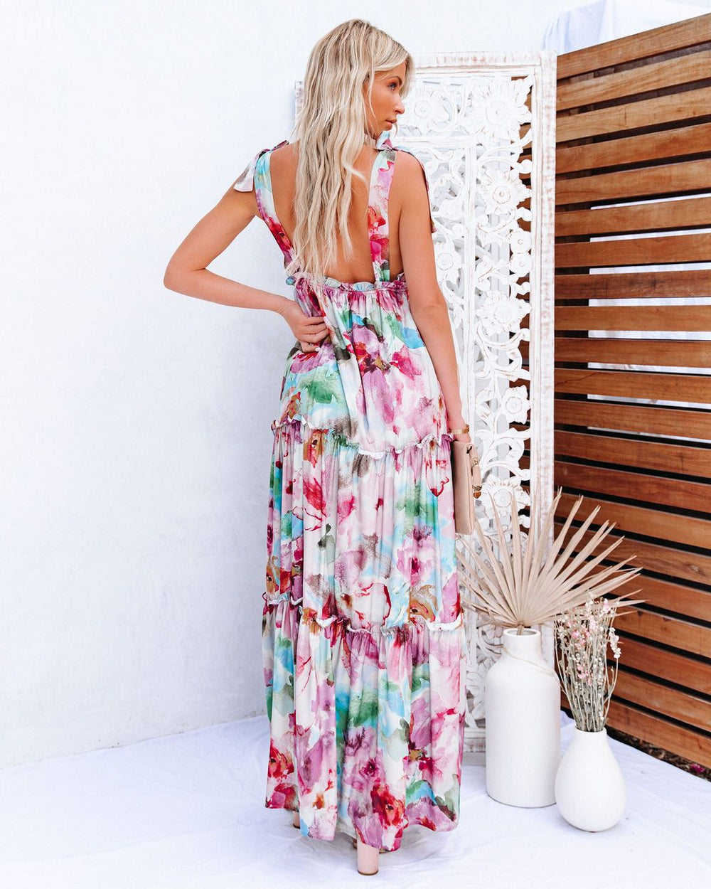//INSSTREET// Notre robe longue à volants et poches « Beyond The Waterfall » est une véritable œuvre d'art ! Des motifs floraux couleur pierre, fuchsia, orange, bleu ciel, vert chasseur, olive et rose poudré s'entremêlent dans un style aquarelle. Elle est dotée de bretelles ajustables et d'un décolleté en V. Portée avec les sandales à talons croisées « Twiggy », la pochette zippée bandoulière « Stella », le collier « Layers of My Heart », le collier sautoir « Archer », le bracelet perlé « Memorable » et les boucles d'oreilles créoles « Perfect Hoop ».