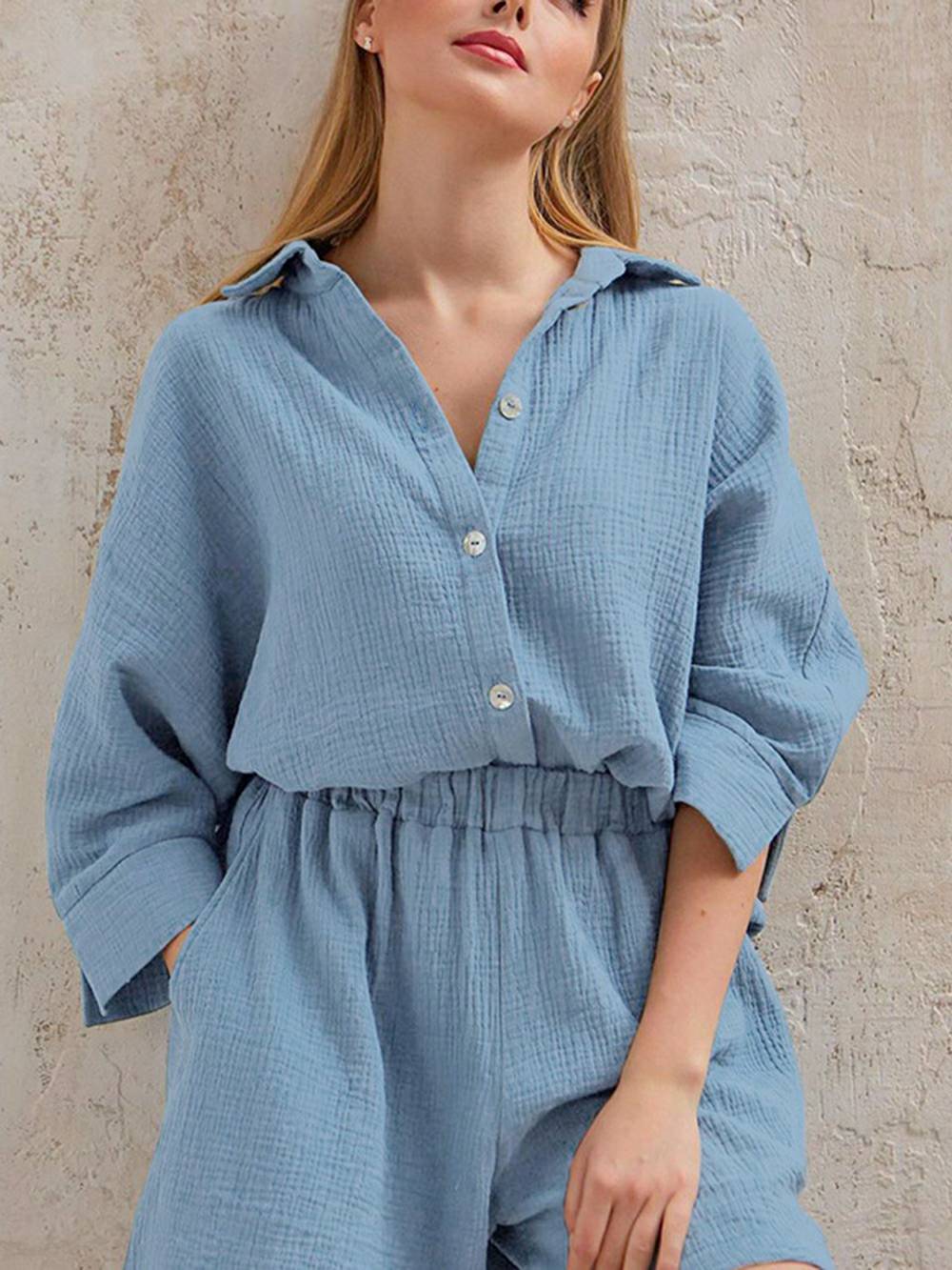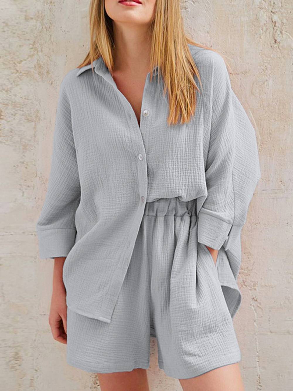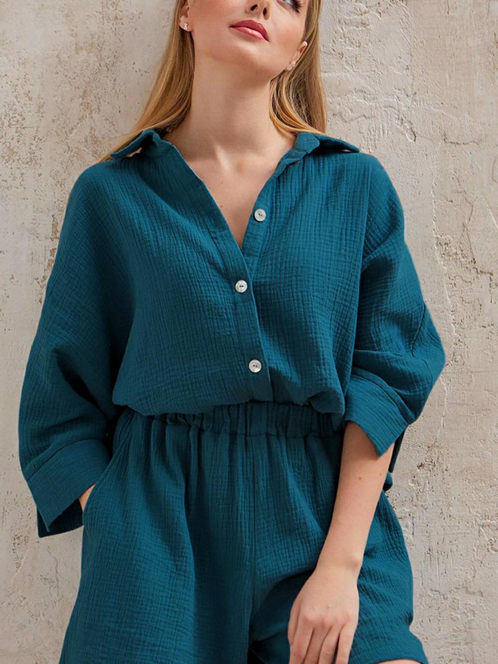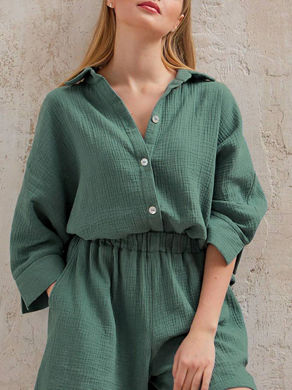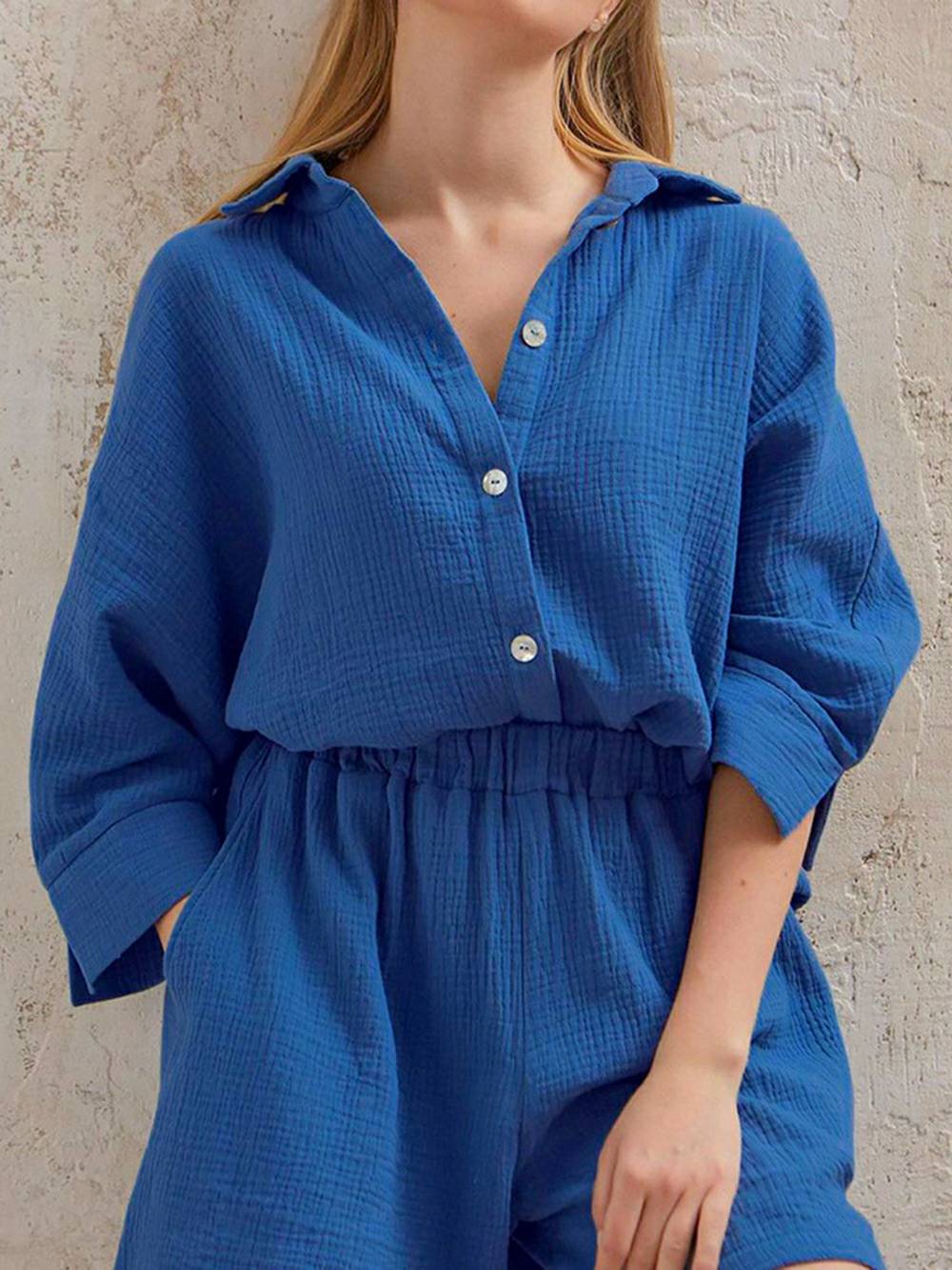 Looking for something feminine, stylish, and comfortable to work from home in? Look no further than our Linen Set! Made from breathable linen cotton, this set is perfect for hot summer days or cozy winter nights. The blouse top features short sleeves and a button fly, while the bermuda shorts have a high waisted fit. Sustainable, anti-static, and comfortable, this set is perfect for any woman who wants to feel like a boss!