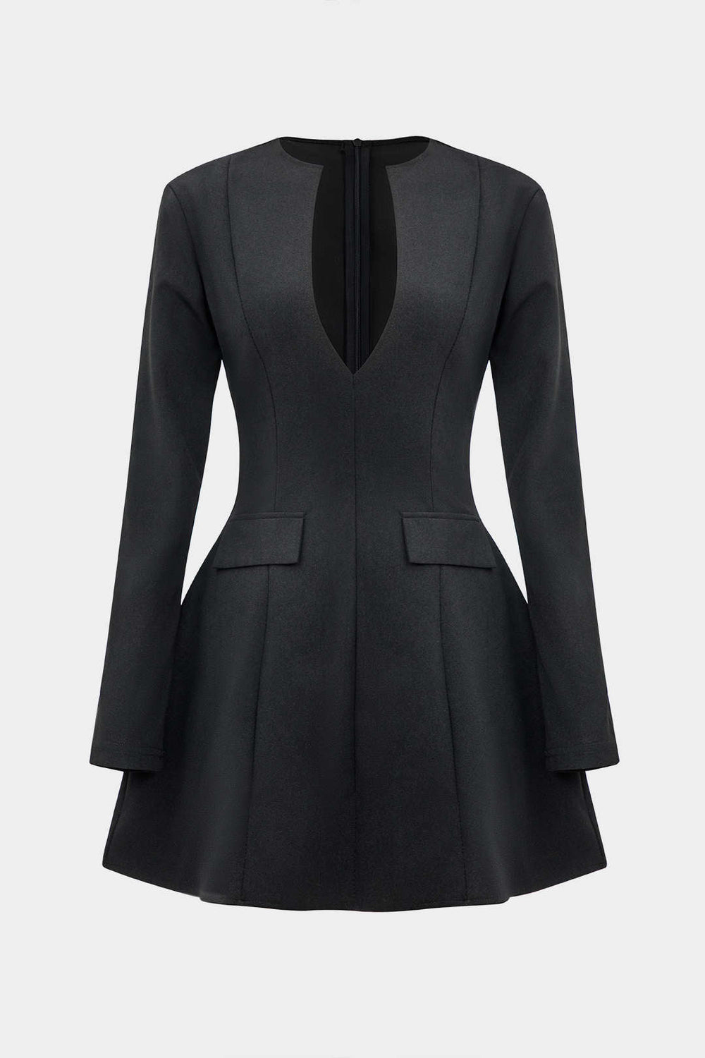 Solid V-neck Fake Pockets And Zipper Mini Dress