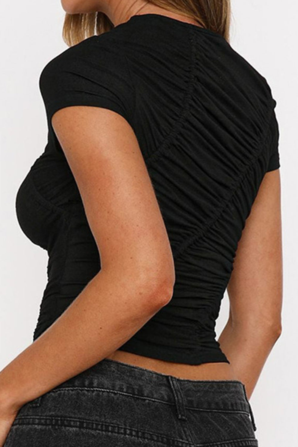 Deep V-neck cap sleeve top with a fitted silhouette and adjustable back tie for a snatched look. Soft stretch fabric hugs in all the right places. Deep plunge neckline Cap sleeves Adjustable tie-back Body-hugging fit Soft stretch fabric