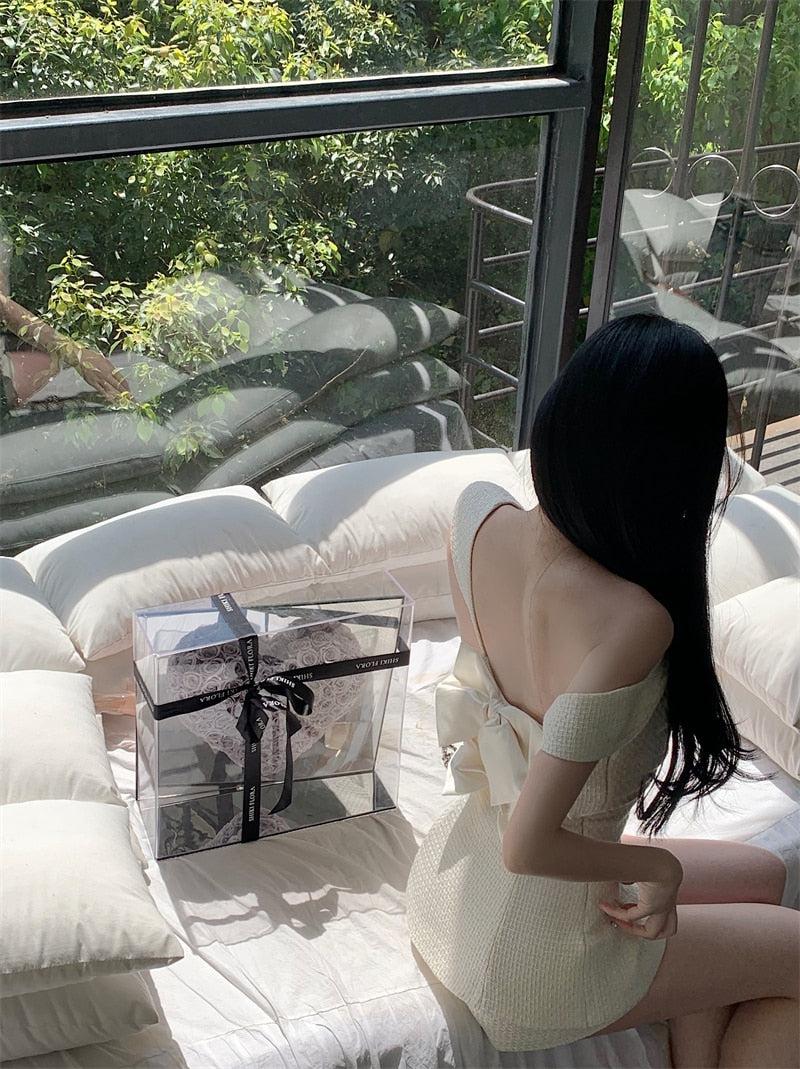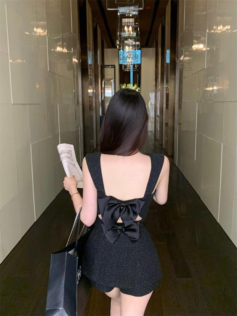Un ensemble deux pièces qui revisite l'esthétique Barbiecore avec une touche d'originalité. Il se compose d'un haut rayé orné de boucles en diamant et de rubans dans le dos. Les bretelles ajustables et la fermeture éclair latérale du haut offrent un confort personnalisé. Un short à fermeture éclair discrète complète l'ensemble. Ensemble, ils créent un look mini-robe à la fois unique et stylé, un clin d'œil à l'emblématique esthétique Barbie.