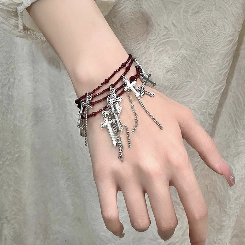 Couleurs : Collier croix à perles rouges, Collier croix à perles noires, Bracelet croix à perles rouges