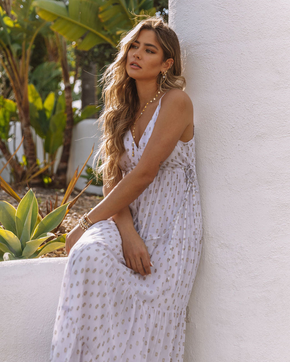 Soyez la plus élégante des invitées au mariage avec notre robe longue Donna à détails métalliques ajustables ! Cette robe longue lilas est ornée de détails métalliques dorés et possède une taille empire ajustable par cordon. À porter avec les sandales à plateforme et talons Go On en similicuir, la pochette Stella à bandoulière zippée, le sac Cha Cha Lariat, le bracelet Memorable et les boucles d'oreilles Perfect Hoop.