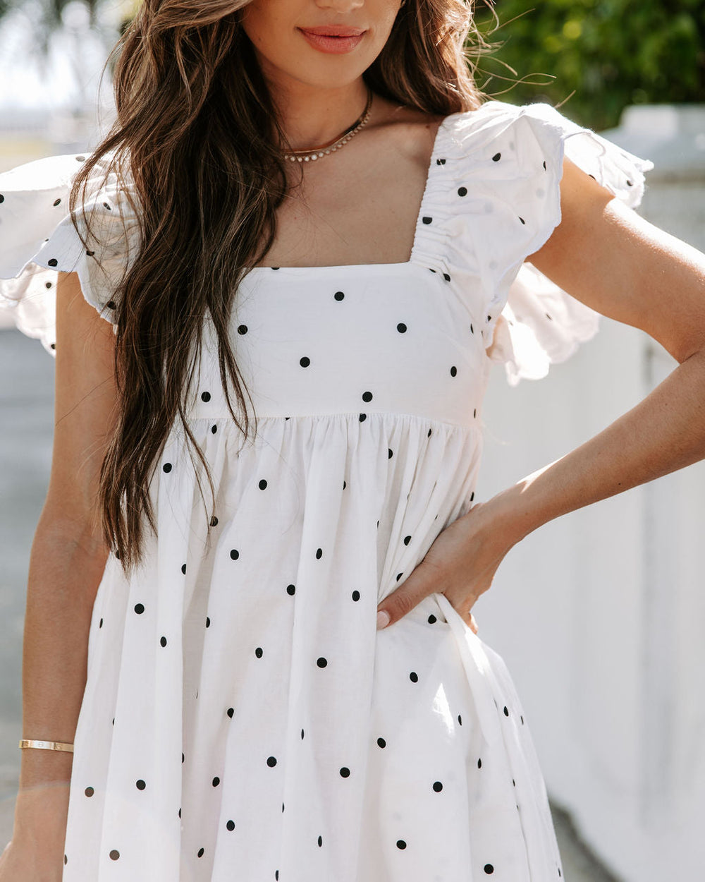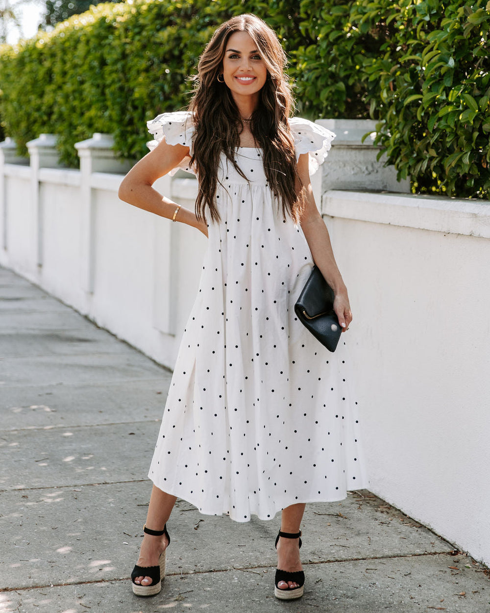 Élégante et adaptée aux femmes enceintes, la robe midi Edith en coton blanc à pois noirs et poches présente des bords festonnés.