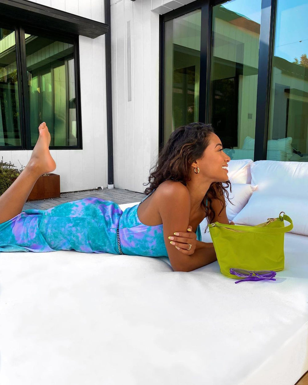 Chic et printanière, la robe nuisette midi en satin imprimé Eventide, dans des tons aquarelle turquoise et orange, présente un décolleté carré.