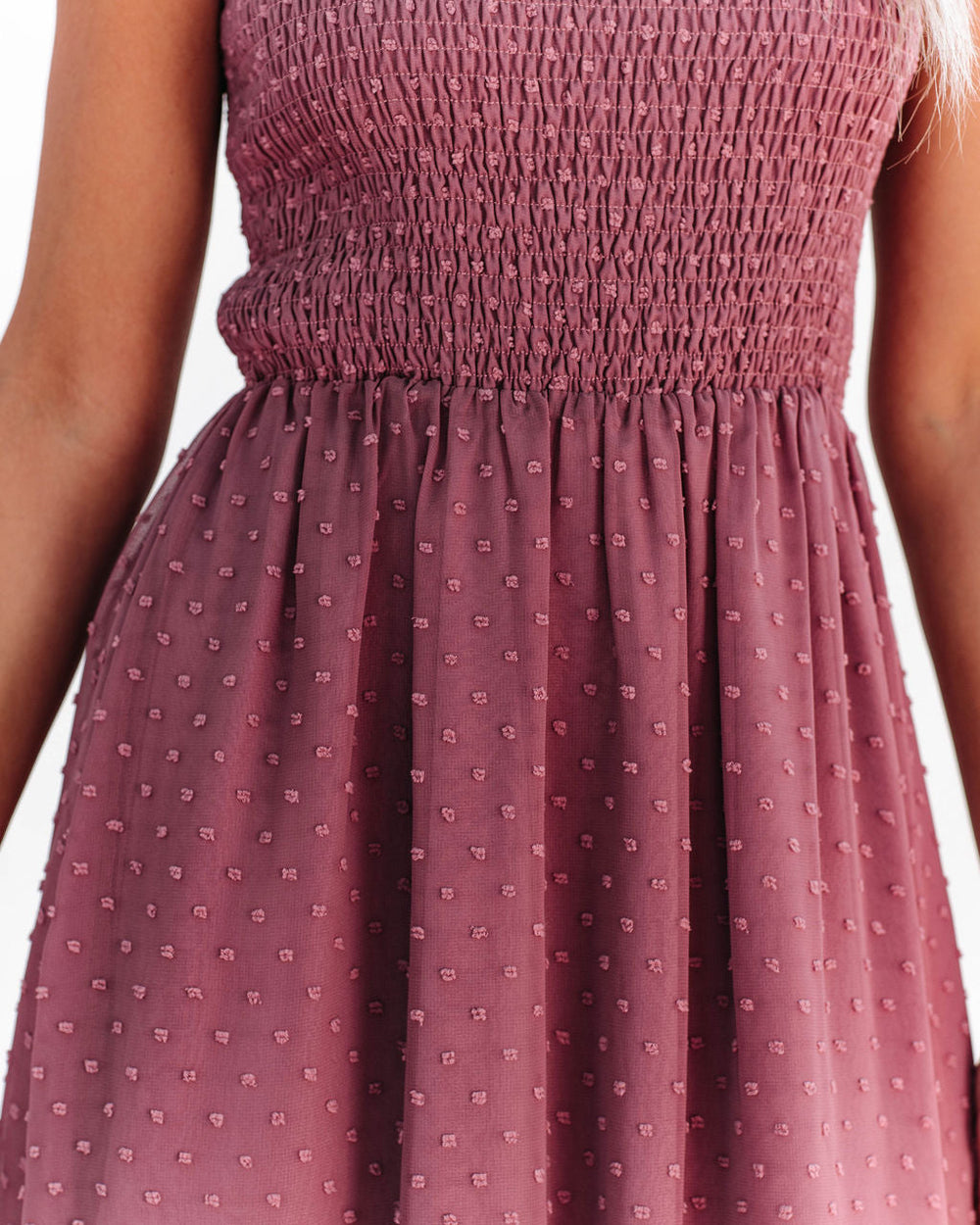 Le printemps approche à grands pas et notre robe longue Hazelle à pois suisses et smocks est prête ! Cette robe longue mauve présente une encolure carrée. Elle est dotée d'un buste smocké et de bretelles ajustables. À porter avec les boucles d'oreilles Perfect Hoop, le collier Caz Pearl Charm, le mini collier Chloe, le collier pendentif Khloe, le bracelet jonc Simple, le sac à main Desire à chaîne tissée rembourrée et les sandales à talons carrés Chandler.