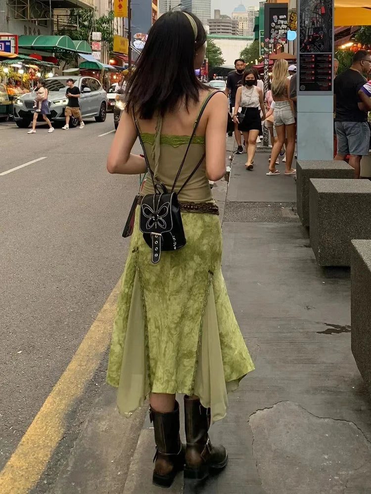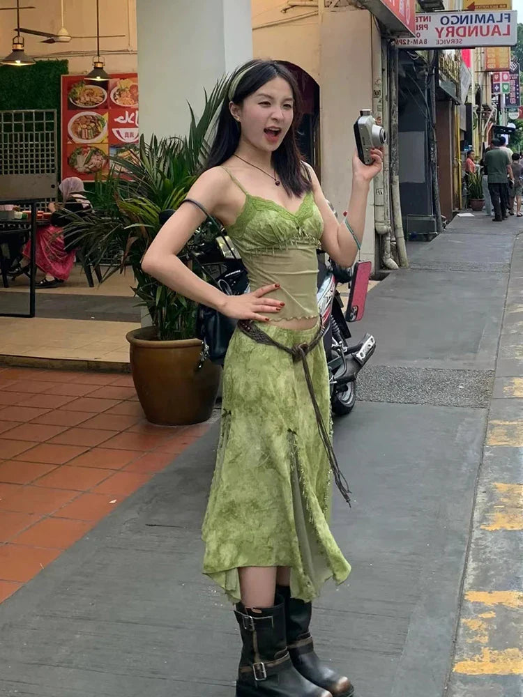 Summer Women Birthday Vintage Gyaru Boho Style Vacation Rave Beach Outfits 2 Piece Set Patchwork Halter Top + Fairy Midi Skirts
