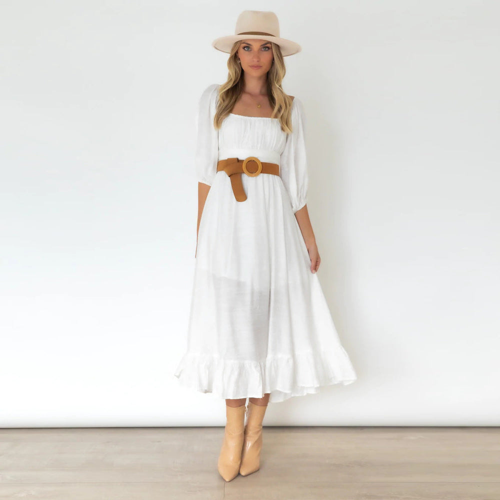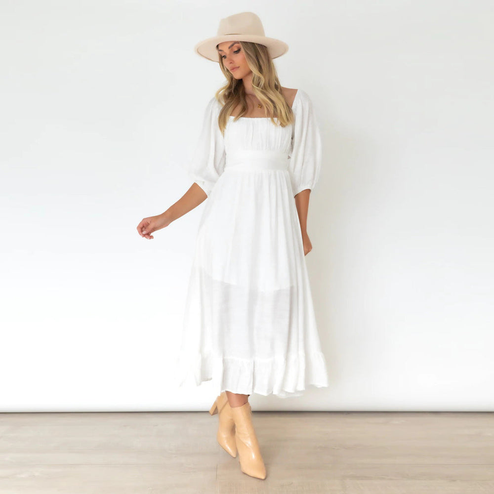 //INSSTREET// Notre robe midi Katelyn à manches bouffantes est idéale pour toutes les occasions estivales. De couleur pêche claire, elle présente un décolleté carré et des manches bouffantes.