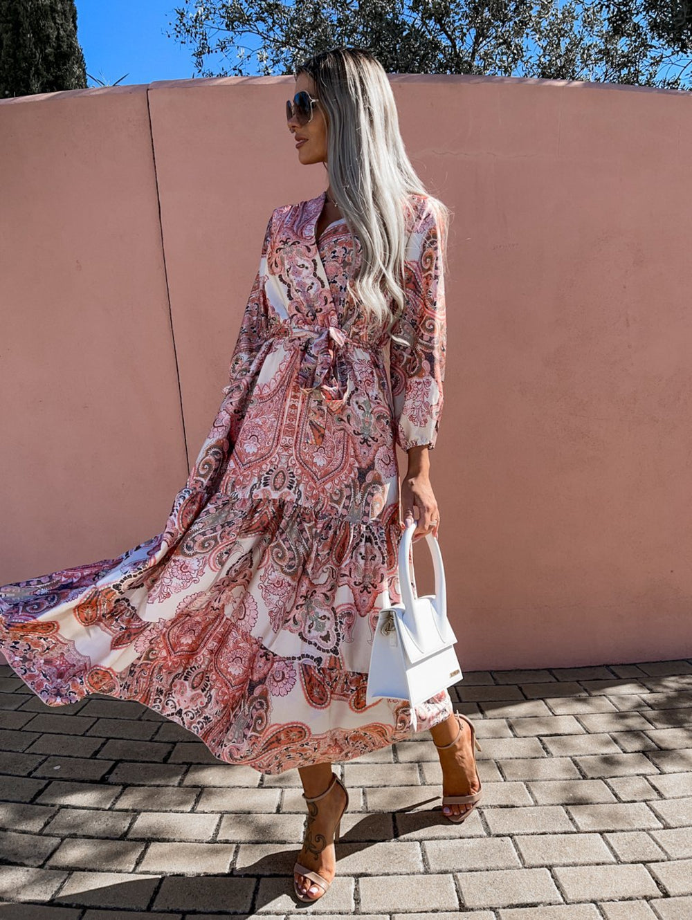 //INSSTREET// Notre robe midi à volants imprimée Katerina est résolument féminine ! Des motifs floraux mauve, rouille, orange, ivoire, jaune et rose ornent cette robe midi à volants. Elle est dotée d'un décolleté fendu et de liens à nouer. Portée avec le chapeau El Dorado, les créoles Gabi, le ras-de-cou à 5 disques, le collier pendentif Sia, le bracelet jonc simple, la pochette bandoulière zippée Stella et les bottines à talons froncées en faux daim Marant.