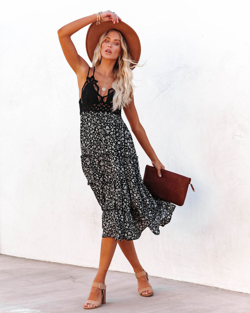 Accueillez les douces chaleurs du printemps avec notre robe midi en dentelle florale à volants « Let It Be » ! Un imprimé floral noir et blanc orne la jupe de cette robe longue, tandis que le corsage en dentelle noire apporte contraste et élégance. Bretelles spaghetti ajustables. À porter avec le chapeau El Dorado, les boucles d'oreilles créoles Perfect Hoop, le mini collier Chloe, le collier Mosaic Coin, le bracelet jonc torsadé Cling, le cardigan en maille à poches Pale September et les bottines à talons en faux daim Uptown.