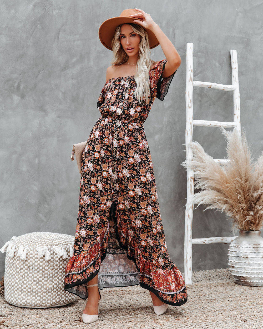 Notre robe longue Liam à épaules dénudées et coupe asymétrique est une version bohème moderne ! Des fleurs noires, saumon, rouille, orange, sauge et ivoire ornent cette robe. Coupe épaules dénudées. À porter avec le chapeau El Dorado, le ras-de-cou à 5 disques, le collier Roue de Bouddha, le bracelet jonc simple, la pochette bandoulière Stella à fermeture éclair et les escarpins pointus Ritz en faux daim.