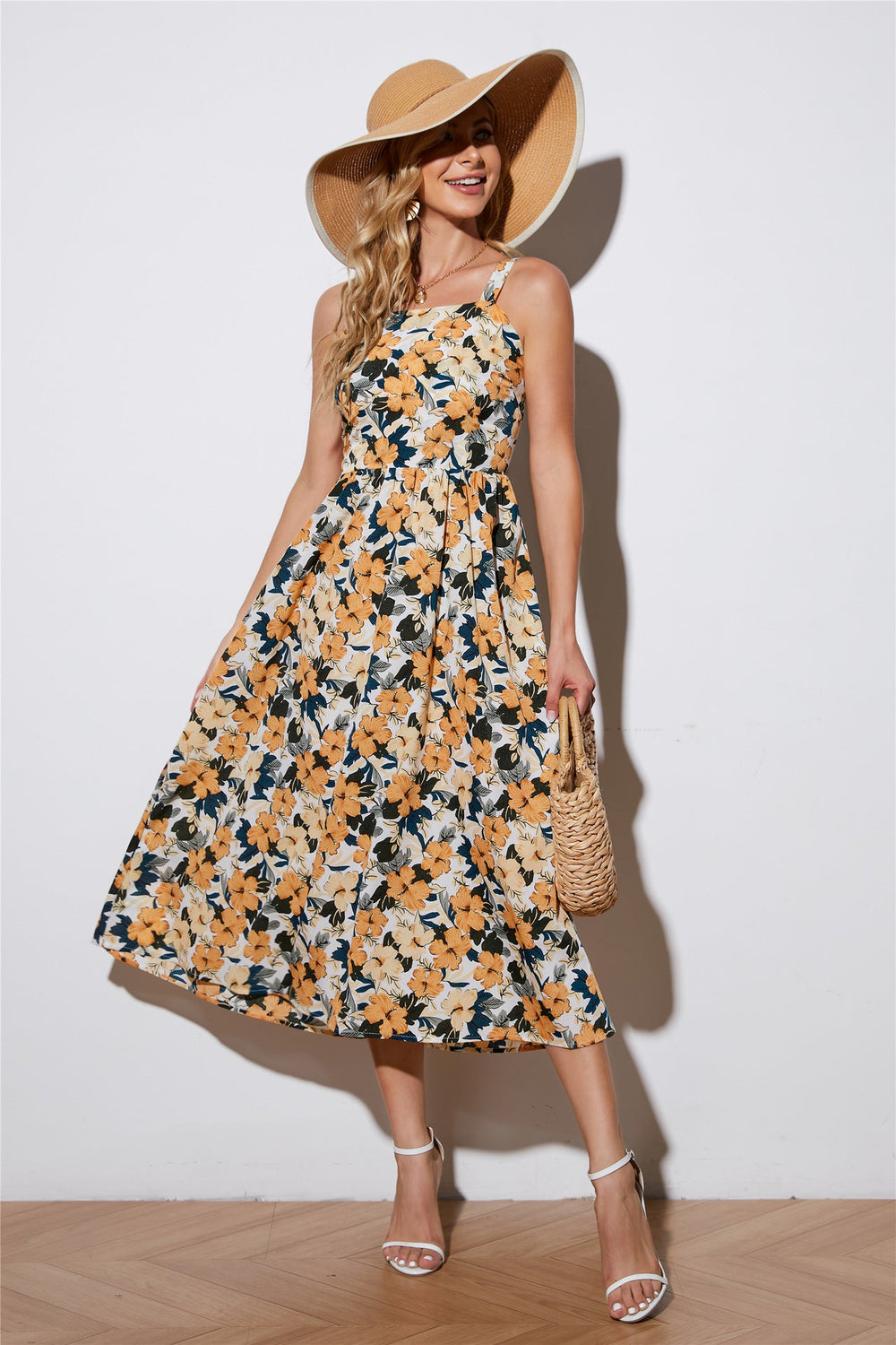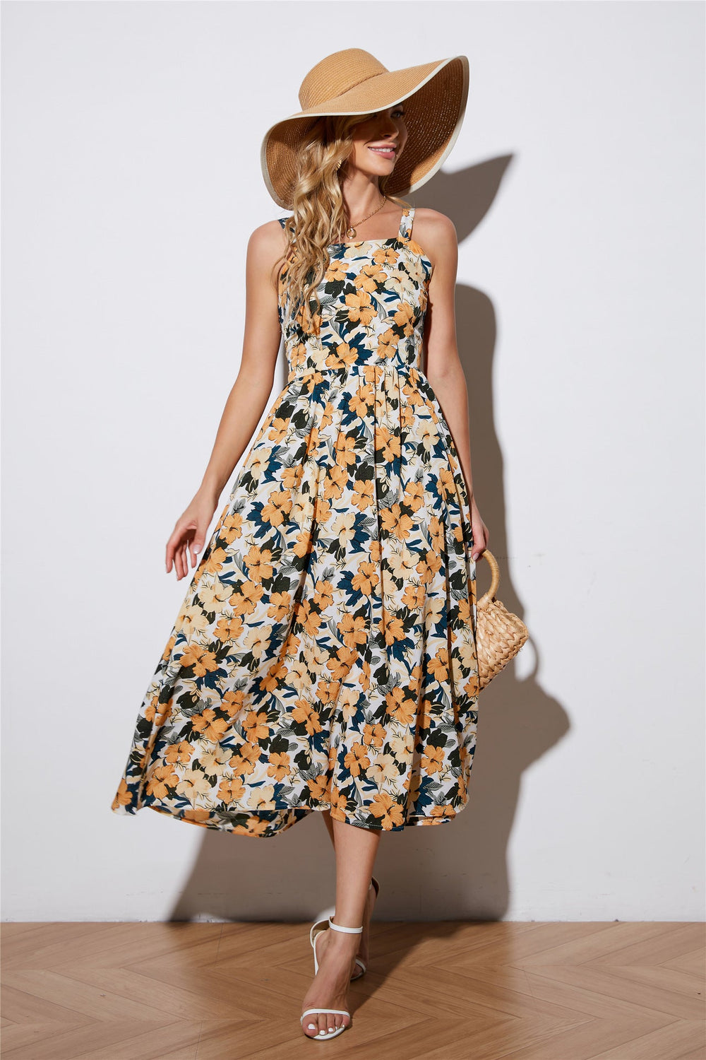 Notre robe longue à volants et boutons Nisha à imprimé floral est idéale pour la transition été-automne ! Ses imprimés floraux rose poudré, rose, moka, moutarde, turquoise et noir composent cette robe à volants. Fermeture boutonnée sur le devant. À porter avec le canotier en paille Kaine, le collier Gaia et les sandales à talons carrés et bride transparente Heather.
