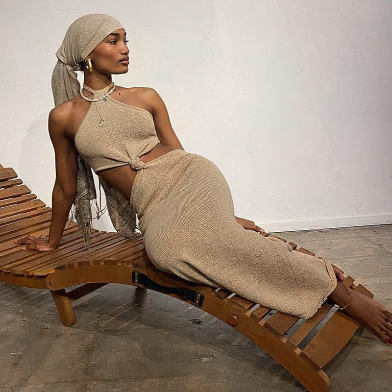 // Exclusivité InsStreet // Osez un look sensuel avec notre robe midi dos nu Rita en coton découpé ! Cette robe midi en maille de coton couleur sable possède un col halter et une fermeture à nouer ajustable. La découpe à la taille ornée d'un nœud central est ultra sexy ! Portée avec les boucles d'oreilles à franges Ingram, le mini collier Chloé, le collier à pièces mosaïques, le bracelet jonc simple, la pochette Shashi Leela et les sandales à talons carrés Cooper.