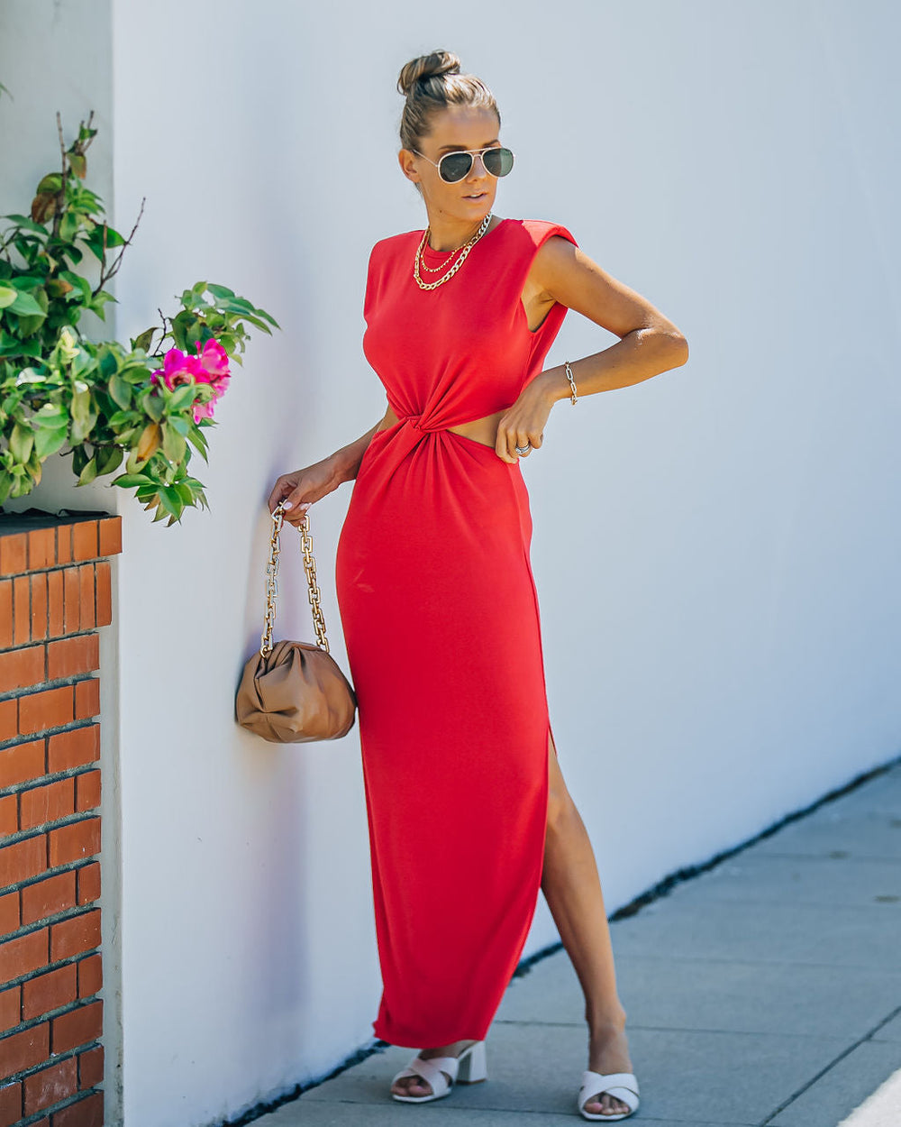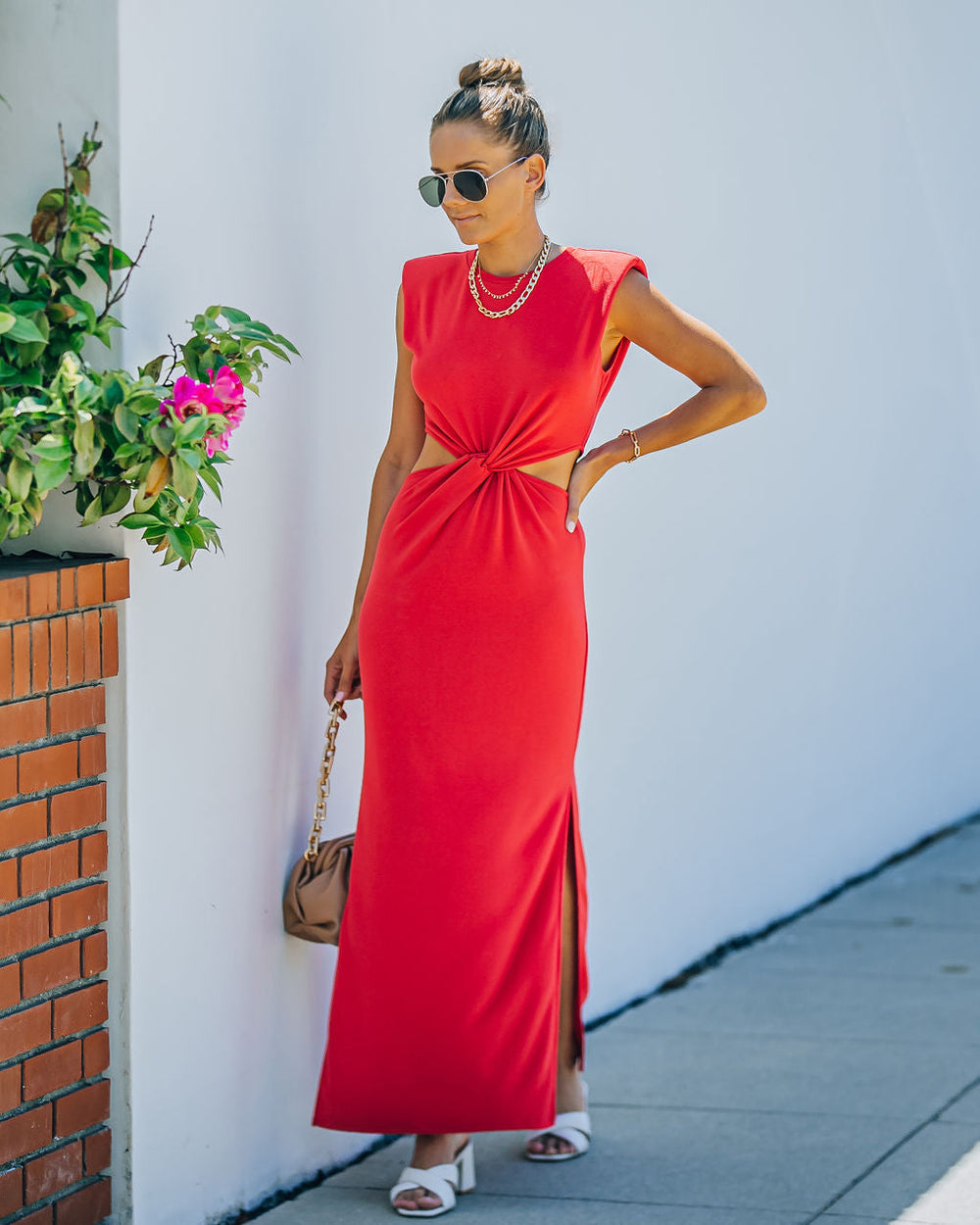 //Best Seller// The Sweet Escape Cutout Twist Knit Maxi Dress is red hot with its padded shoulders and twisted front.